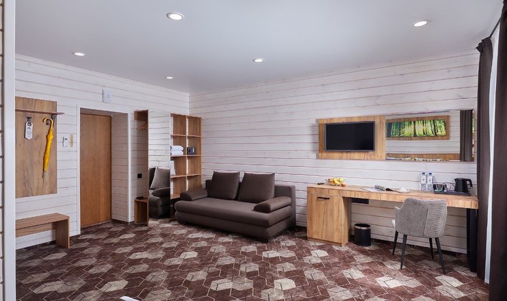 В номере: вешалка, диван, кровати односпальные, кровать двуспальная, прикроватные тумбочки, столик журнальный, тумба багажная, шкаф, Мини-кухня, микроволновая печь, набор посуды, плита электрическая, телевизор, телефон, холодильник, электрочайник