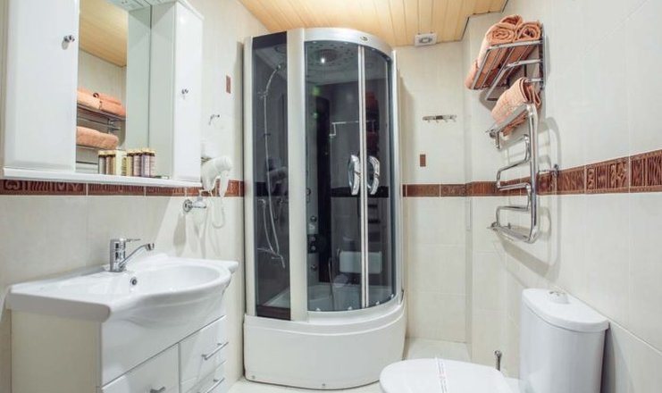 Санузел: с душевой кабиной, тапочки, туалетные принадлежности, фен, халат
