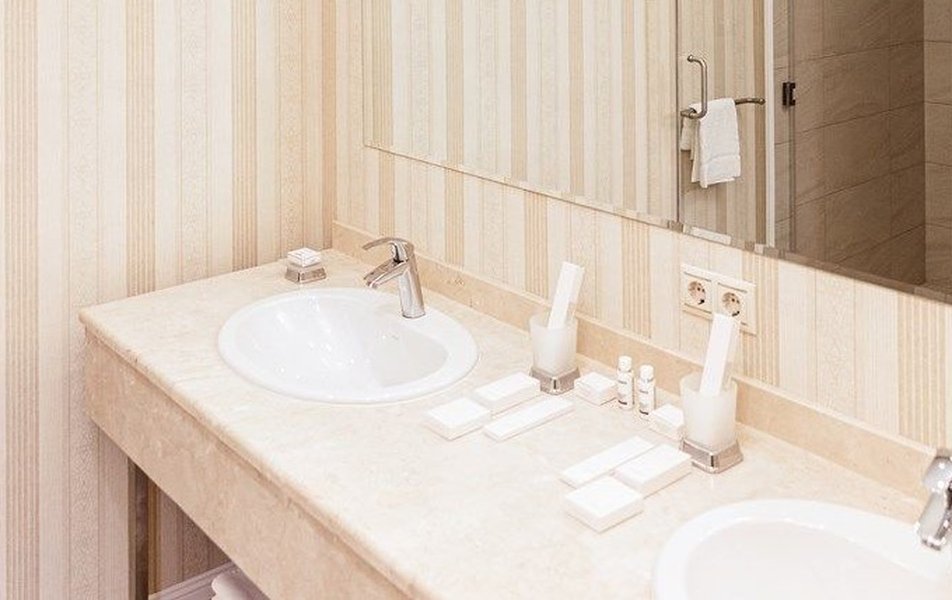 В номере: вешалка, зеркало, диван, кровать двуспальная, прикроватные тумбочки, стол, стулья, шкаф, кондиционер, сейф, телевизор, телефон, холодильник