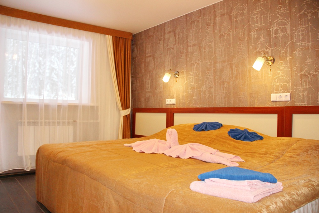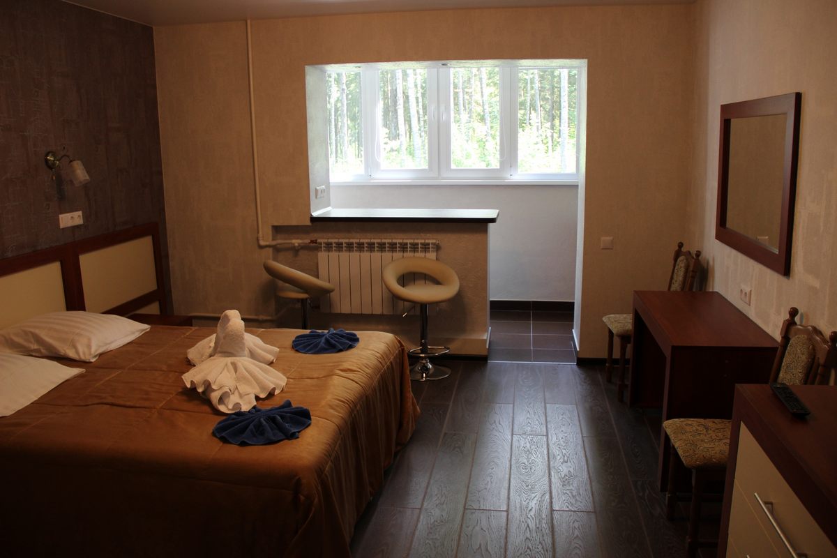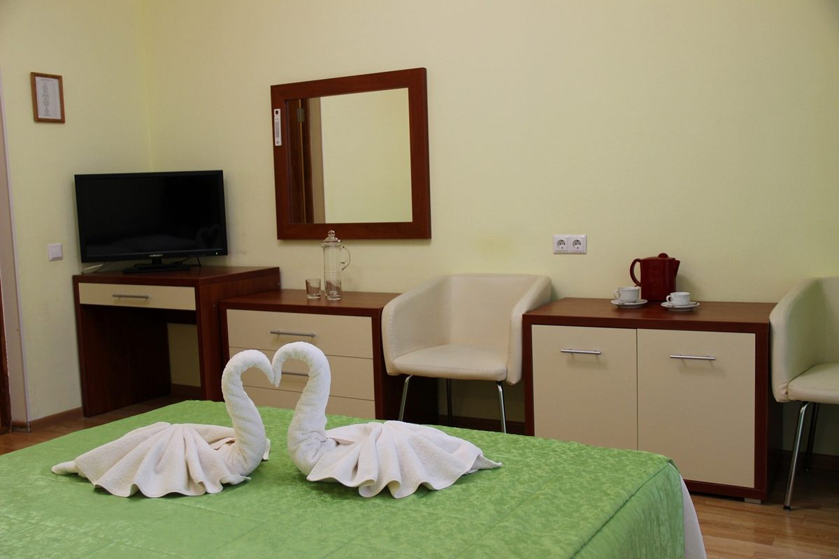 В номере: двуспальная кровать, прикроватные тумбы, стол, стулья, шкаф, тахта, телевизор, холодильник, электрочайник, утюг с гладильной доской, сушилка для белья, набор посуды