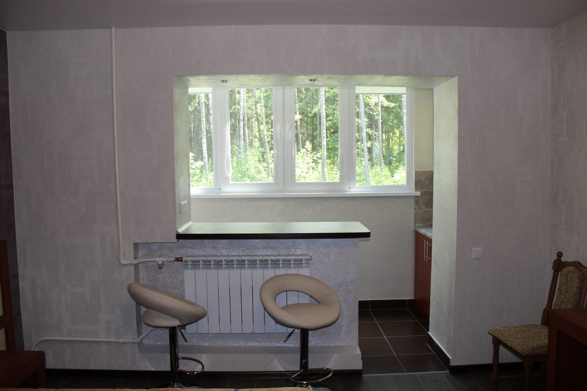 В номере: двуспальная кровать, прикроватные тумбы, стол, стулья, шкаф, телевизор, холодильник, электрочайник, утюг с гладильной доской, сушилка для белья, набор посуды