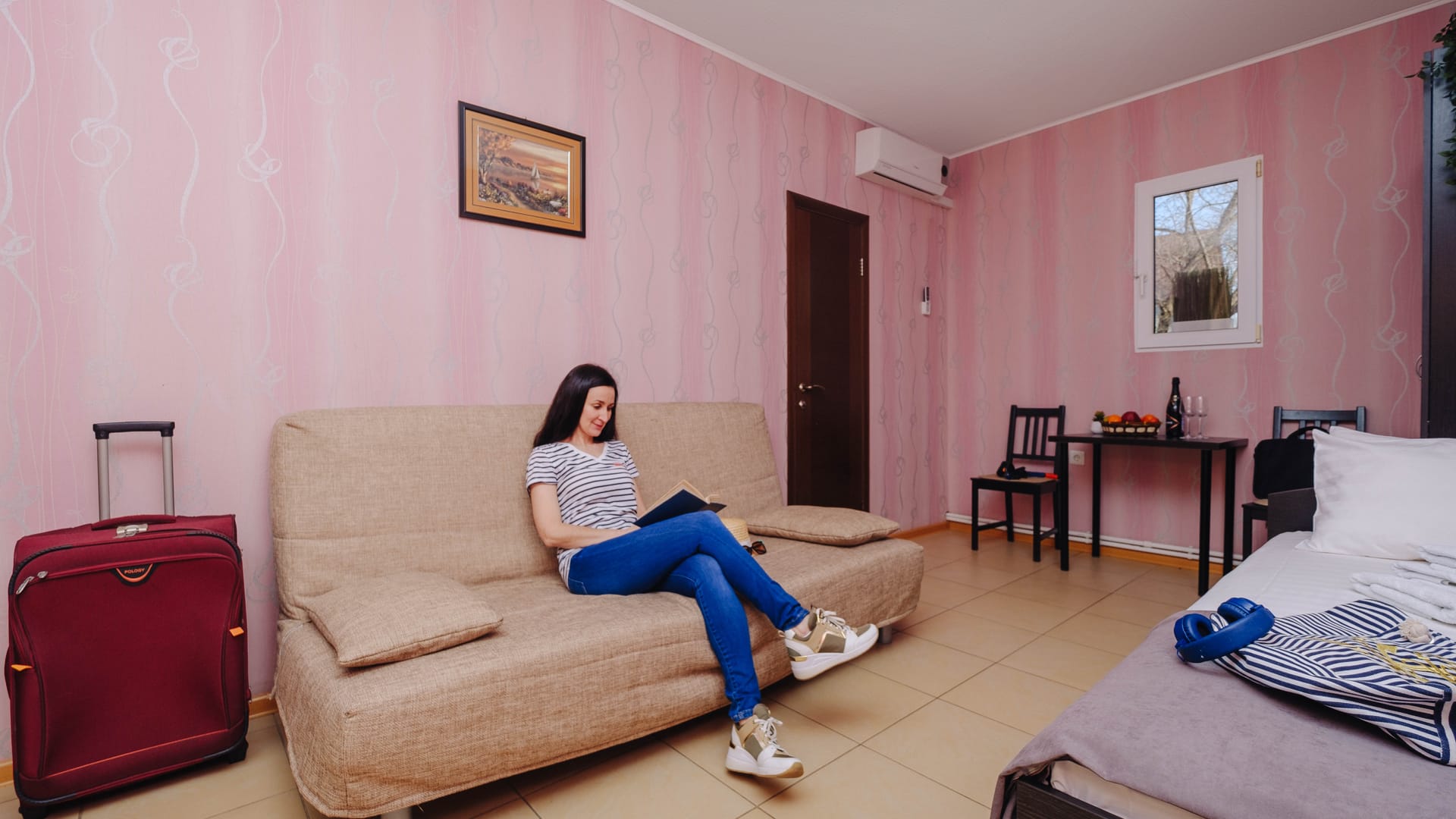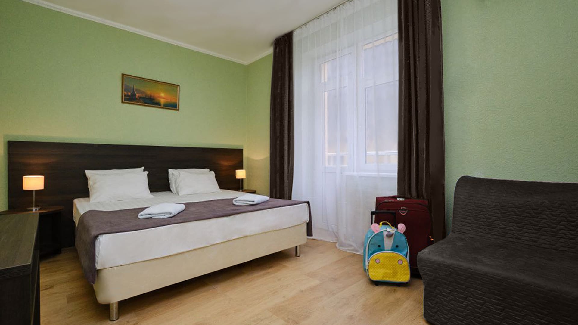 В номере: двуспальная кровать, прикроватные тумбы, стол, стулья, диван или кресло-кровать, шкаф, холодильник, плоский телевизор, кондиционер, чайник, утюг (на этаже)