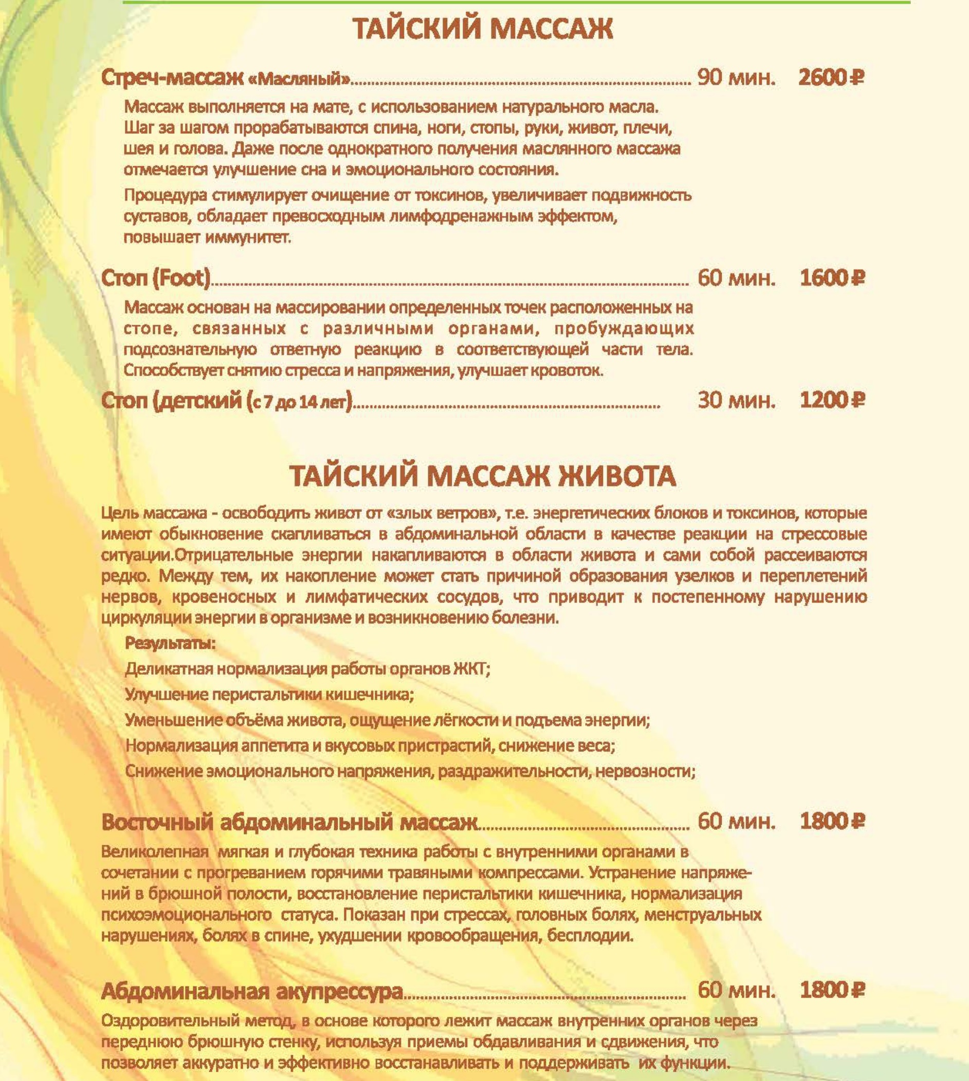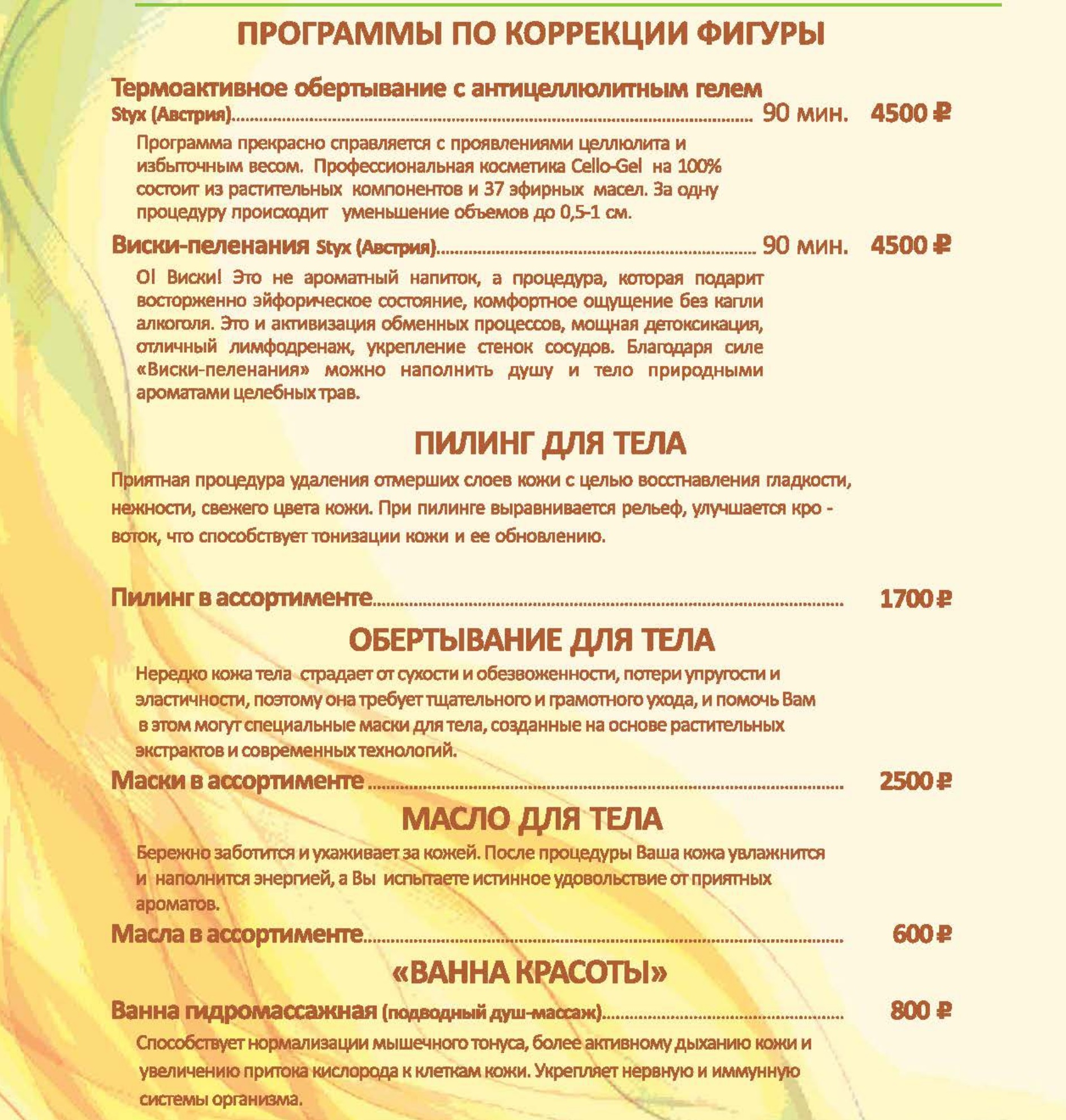 Цены на СПА услуги