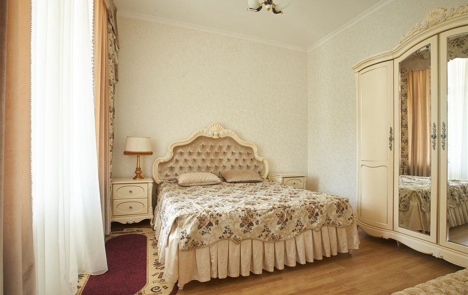 В номере: вешалка, зеркало, кресло, диван, кровати односпальные /одна двуспальная кровать, прикроватные тумбочки, стол, столик журнальный, шкаф, телевизор, телефон, холодильник, чайный набор посуды, электрочайник
