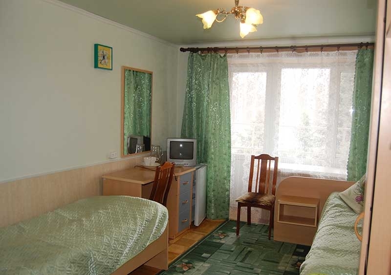 В номере: 2 односпальные кровати, стол, шкаф, тумбочки, телевизор, холодильник