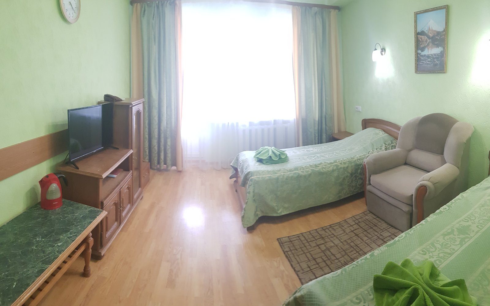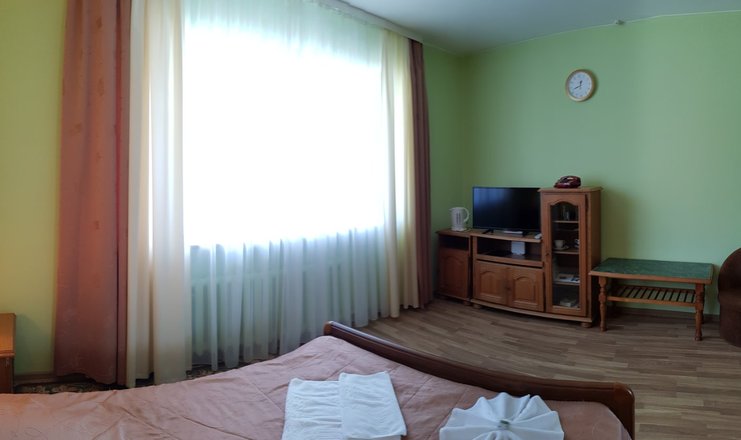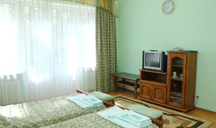 В номере: вешалка, диван раскладной, зеркало, кровати односпальные /одна двуспальная кровать, прикроватные тумбочки, стол, стул, шкаф, телевизор, холодильник, чайный набор посуды, электрочайник