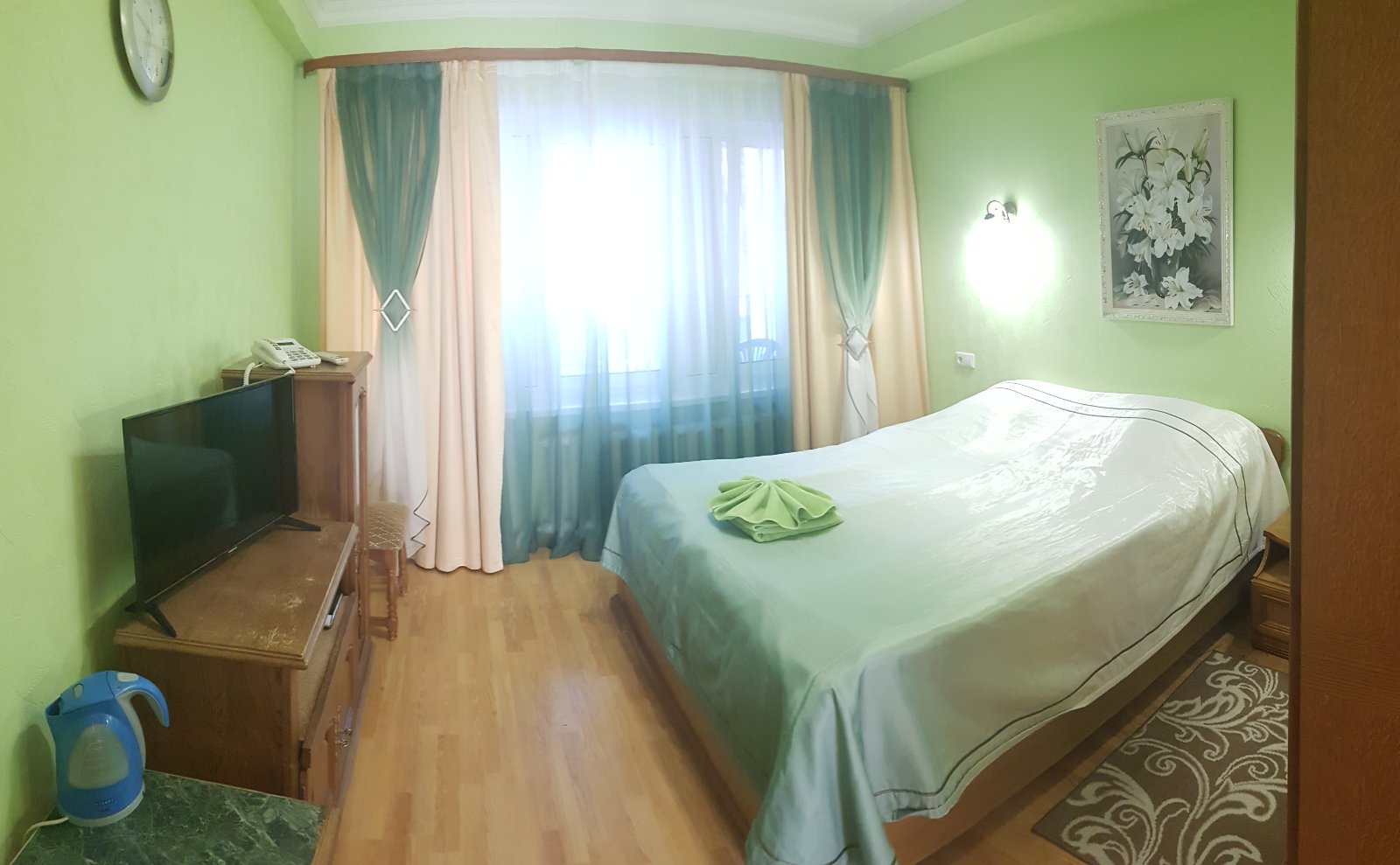 В номере: вешалка, зеркало, кровать двуспальная, прикроватные тумбочки, стол, стул, шкаф, кондиционер, телевизор, холодильник, чайный набор посуды, электрочайник,
