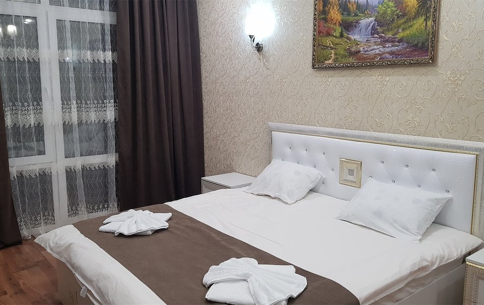В номере: вешалка, диван раскладной, зеркало, кровать двуспальная, прикроватные тумбочки, стол, стулья, шкаф, Мини-кухня, набор посуды, плита электрическая, телевизор, холодильник, чайный набор посуды, электрочайник