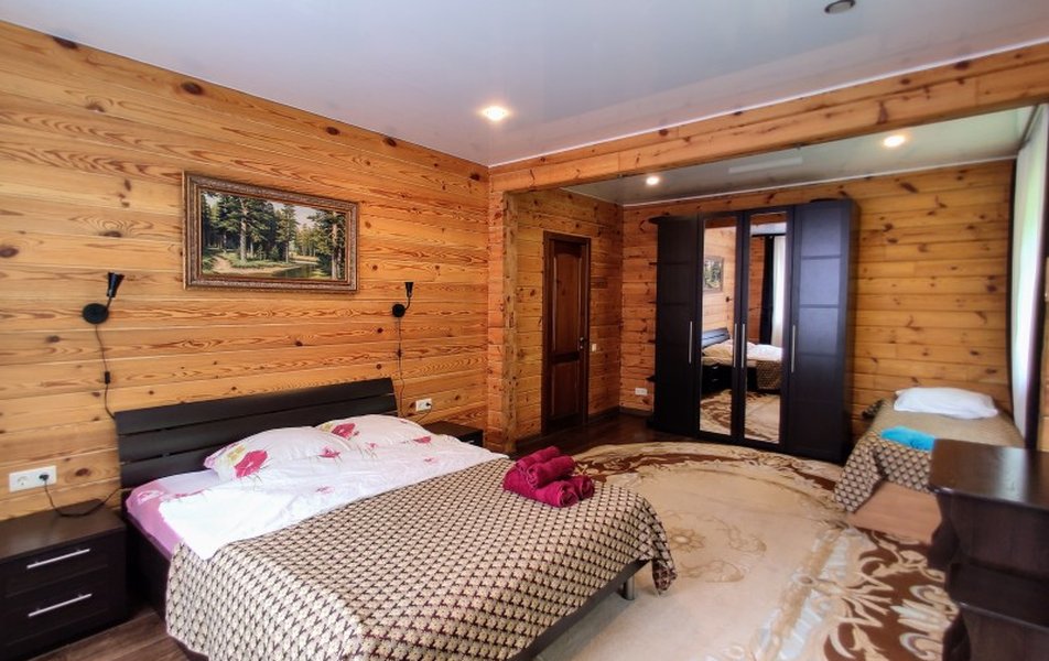 В номере: вешалка, зеркало, кровать двуспальная, кровать односпальная, прикроватные тумбочки, стол, стулья, шкаф, микроволновая печь, набор посуды, телевизор ЖК: смарт, холодильник, электрочайник
