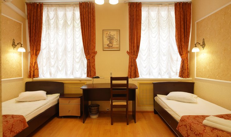 В номере: вешалка, зеркало, кровати полутороспальные, прикроватные тумбочки, стол, стулья, шкаф, телевизор, холодильник, чайный набор посуды, электрочайник
