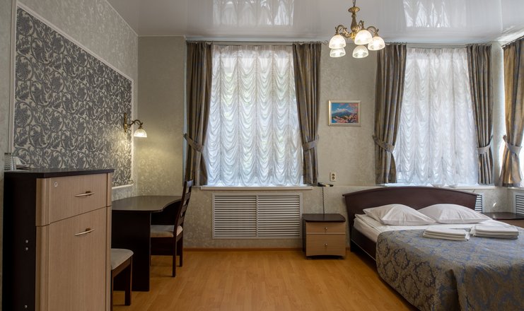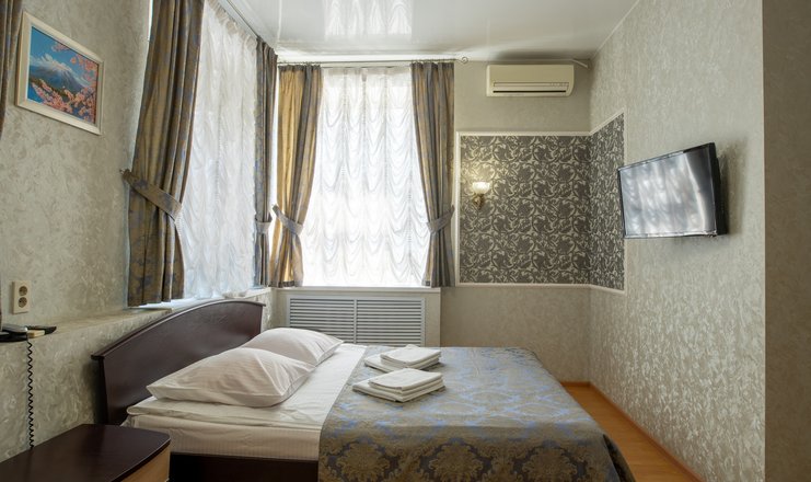 В номере: вешалка, зеркало, кровать двуспальная, прикроватная тумбочка, стол, стул, шкаф, телевизор, холодильник, электрочайник