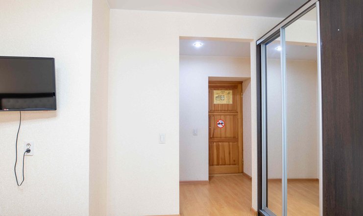 В номере: вешалка, зеркало, кровать полутороспальная, прикроватная тумбочка, стол, стул, шкаф, телевизор, холодильник, электрочайник
