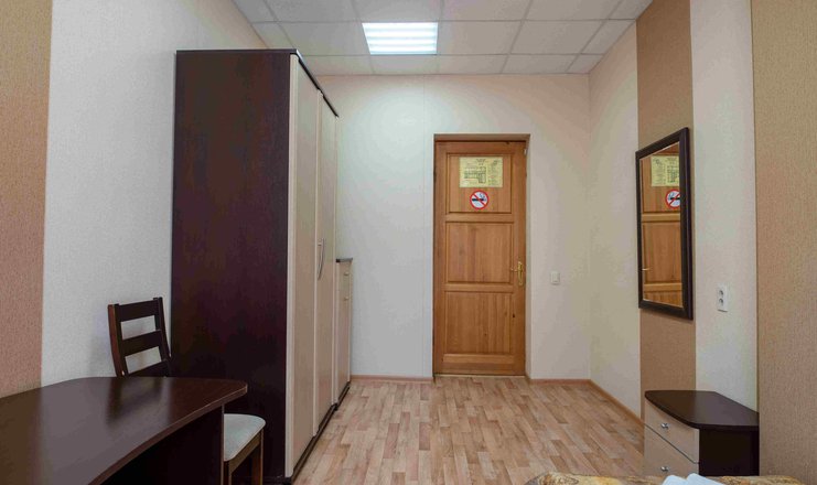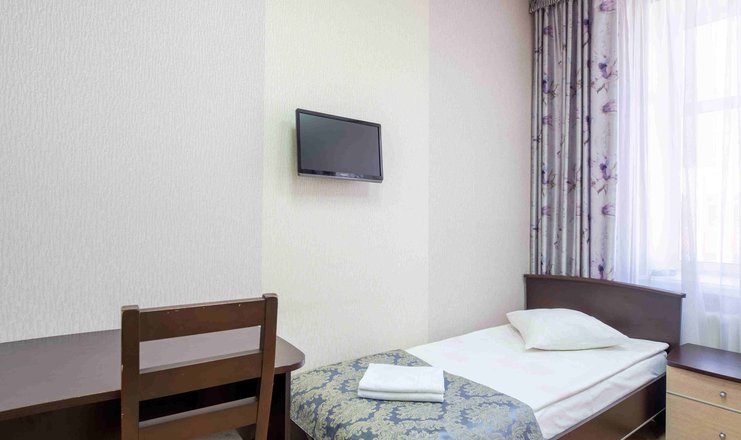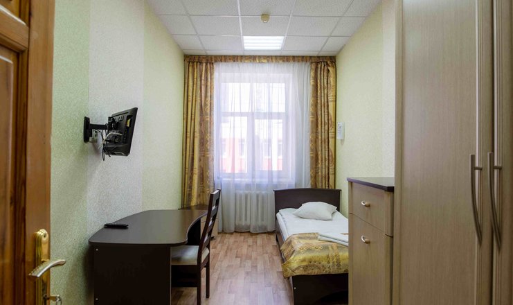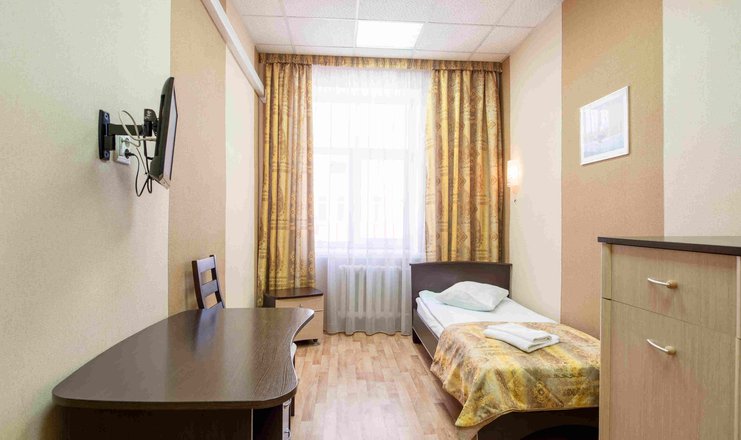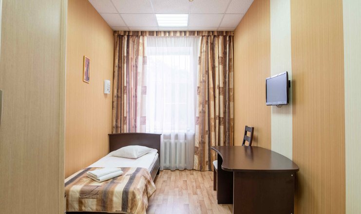 В номере: вешалка, зеркало, кровать односпальная, прикроватная тумбочка, стол, стул, шкаф, телевизор, холодильник